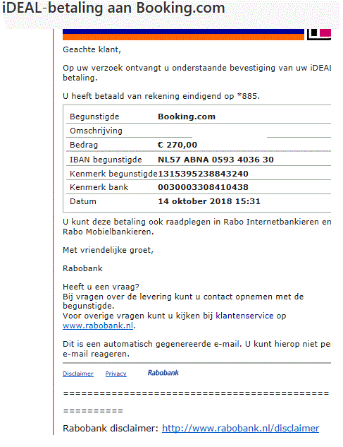 De bevestiging , het reserveringsnummer plus het bewijs van de Ideal betaing worden naar het verkeerde e-mail adres gezonden.